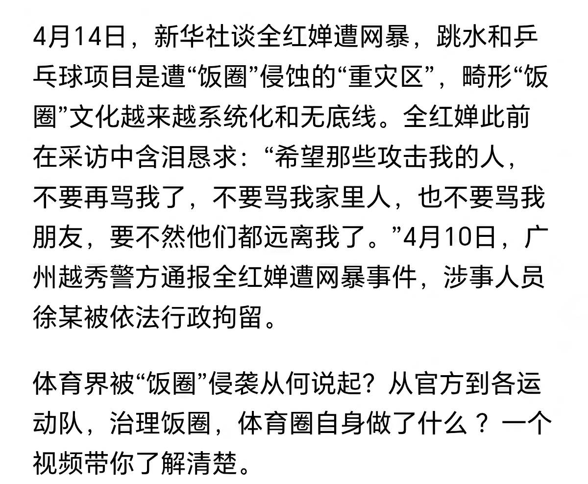 偏偏就在這個節骨眼,央視、新華社、人民日報三大央媒接連下場報道全紅嬋遭網暴事件,新華社更在4月14日專門發文,點名跳水專案是遭「飯圈「侵蝕的「重災區」。