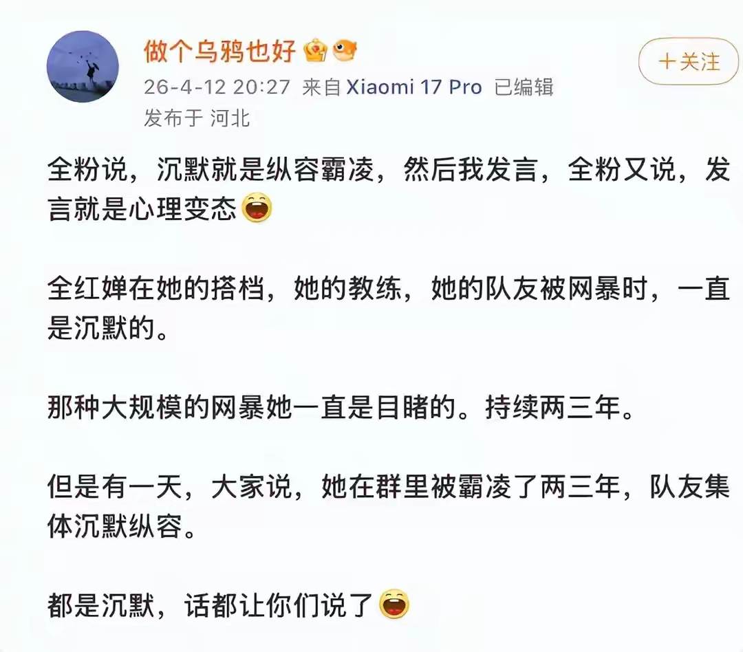 全紅嬋這邊沒有發聲,沒有隔空對罵。