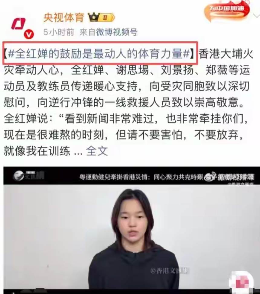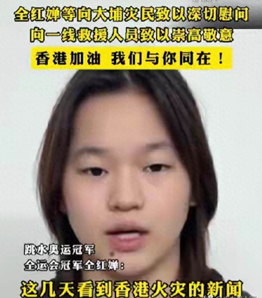 而全紅嬋的發言,沒有一句空泛的大道理,卻比任何華麗的安慰都更有力量。她對著鏡頭真誠地說:「香港的朋友們,大家好!我是跳水運動員全紅嬋。這幾天看到香港火災的新聞,我心裡特別難過,也特別牽掛你們。我知道現在一定是很難捱的時刻,但請一定不要害怕、不要放棄,就像我在訓練時遇到困難一樣,只要堅持住、不退縮,就一定能跨過這個坎!祝願你們往後的每一天都平平安安、順順利利!我們一直和你們在一起!香港加油,你們真的很棒!」
