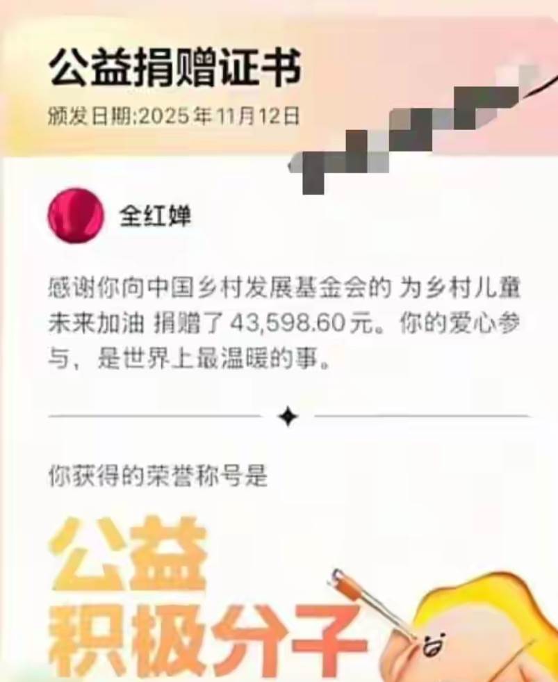 除了對身邊人好,全紅嬋的善意還延伸到了更廣闊的地方。全運會結束後,她在宿舍裡搞了一場直播,和網友們聊聊天,還推薦了田徑、游泳、霹靂舞等全運會專案。這場一個小時左右的直播,總共收到了43598.6元的打賞收入。讓人沒想到的是,全紅嬋毫不猶豫地把這筆錢全部捐給了鄉村兒童公益專案,還曬出了捐款證明。有網友動情地評論:「她這是把溫暖捐給了曾經的自己啊。」