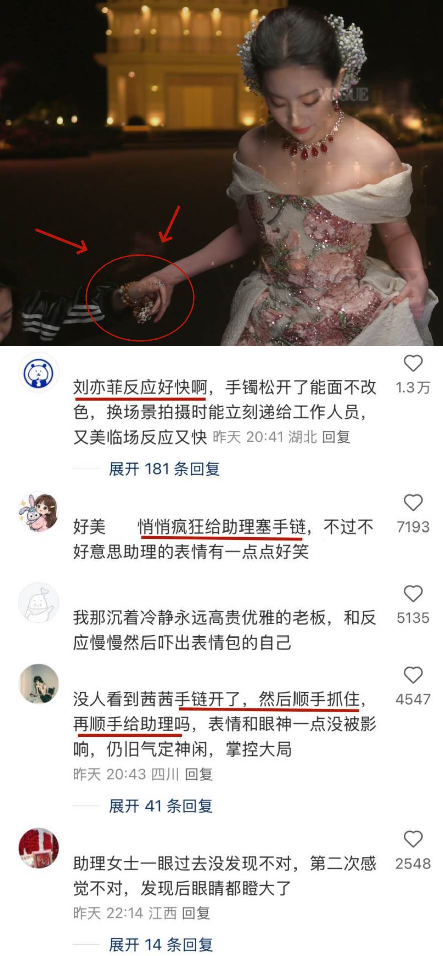 就在這緊要關頭,劉亦菲的反應速度和處理方式令人贊嘆。她迅速而巧妙地將脫落的手鏈撈回,并在助理上前攙扶時,不動聲色地將手鏈轉移到助理手中。整個過程行雲流水,快到旁人幾乎沒反應過來。助理在意識到發生了什麼后,驚訝得瞳孔地震,而工作人員在接過手鏈時也顯得有些愣神。