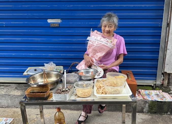 即使下著小雨,鄧超仍在攤位前待了將近半小時,不僅送上花束和中秋禮品,還親切地坐在地上與程奶奶聊天。