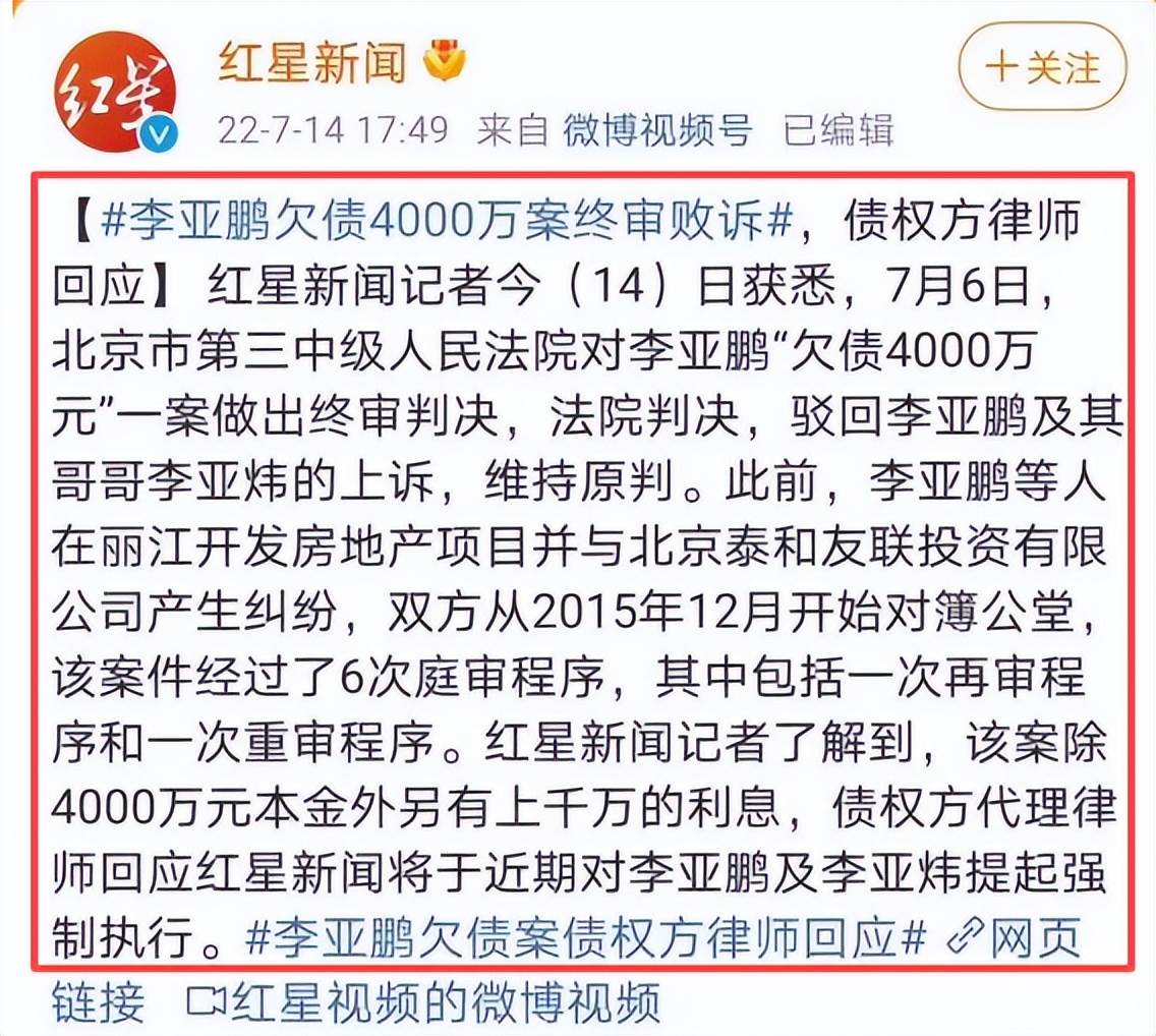 7月,李亞鵬因4000萬債務被起訴,最后敗訴,并被限高。