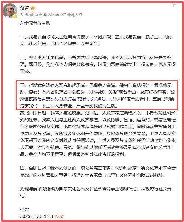 12月11日,范曾發聲明官宣和徐萌喜得獨子,未來一切將交給徐萌打理。