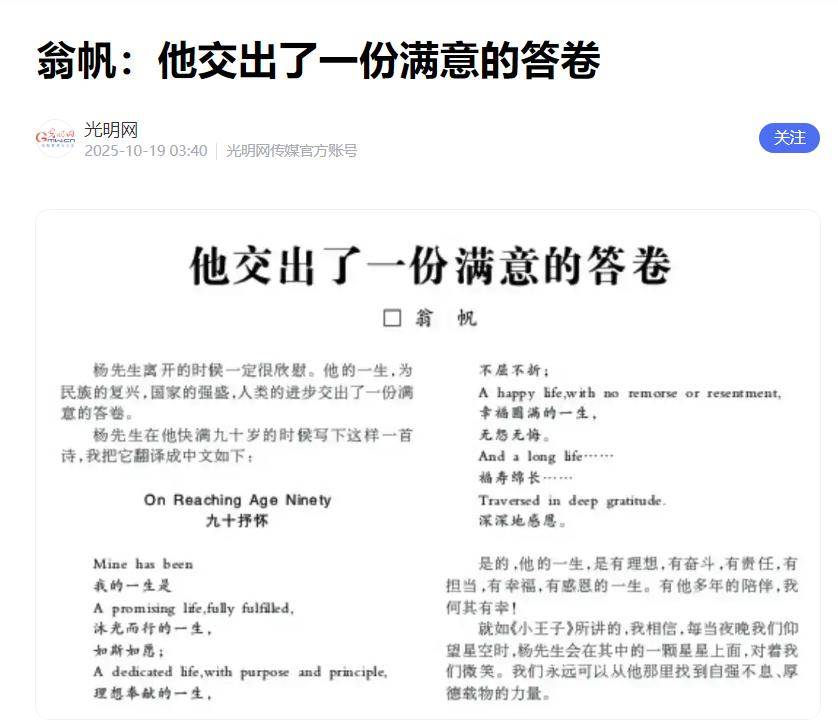 2025年10月18日,偉大的物理學家楊振寧溘然長逝後。