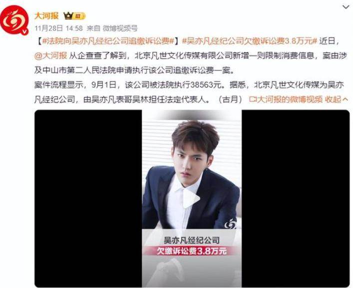 今年11月,吳亦凡的經紀公司北京凡世文化傳媒有限公司因未繳納3.8萬元訴訟費,被法院採取限制高消費措施。