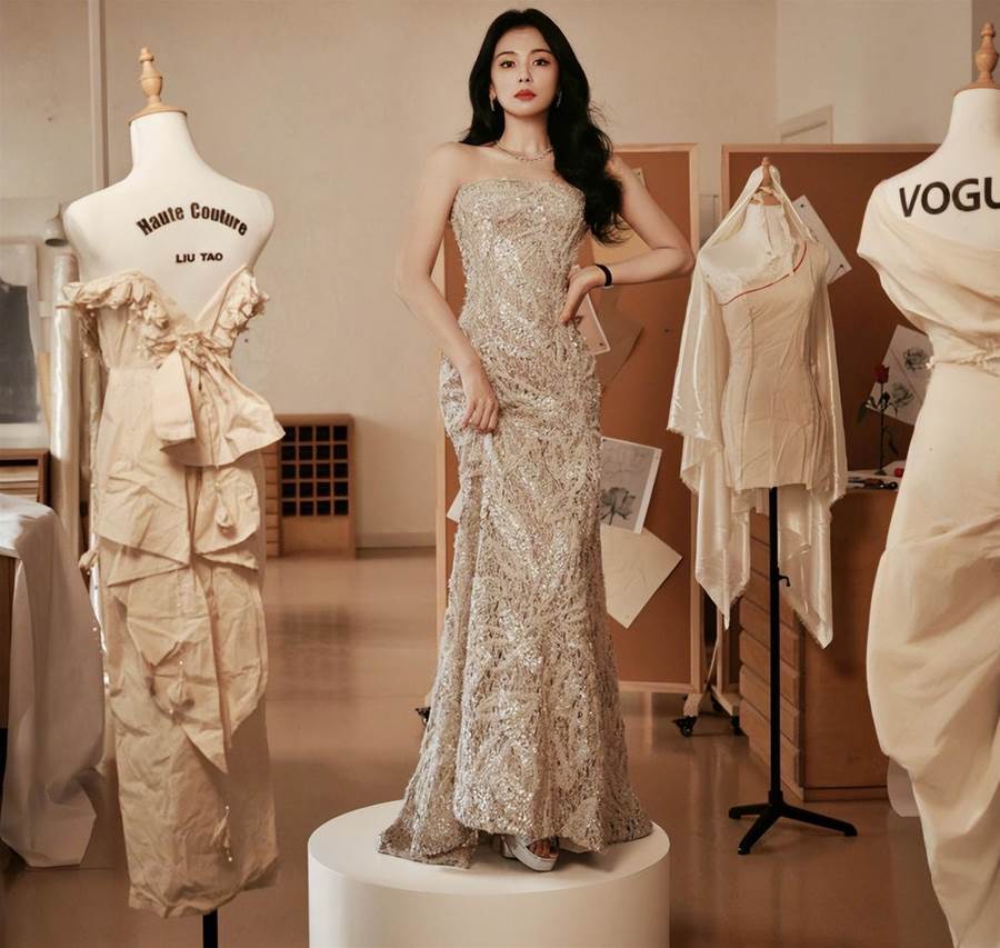 這是在一間工作室里面拍攝的照片,她穿著一件謹慎地亮片禮服裙站在中間的展示台上面,