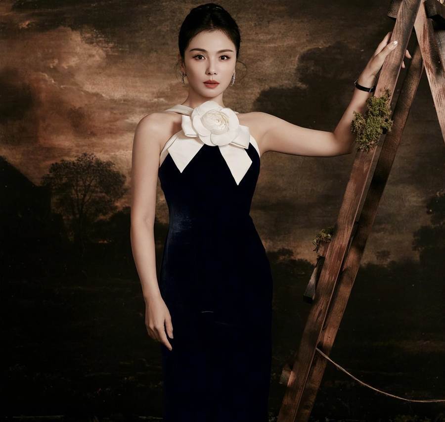 緊接著就發出了一組藝術照片,她穿著一件黑色的謹慎禮服是掛脖的設計,胸口處有一個大大的花朵設計,
