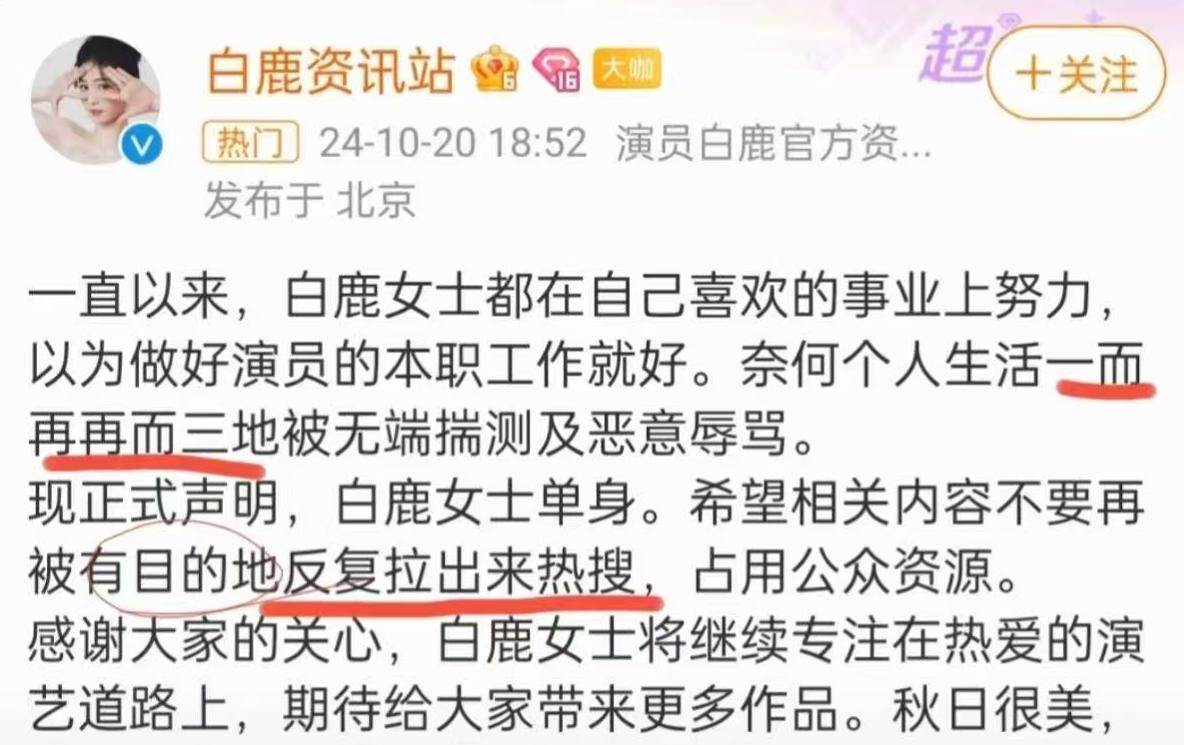 這場緋聞持續了兩年才畫上句號,白鹿資訊站釋出宣告,明確說明白鹿單身。