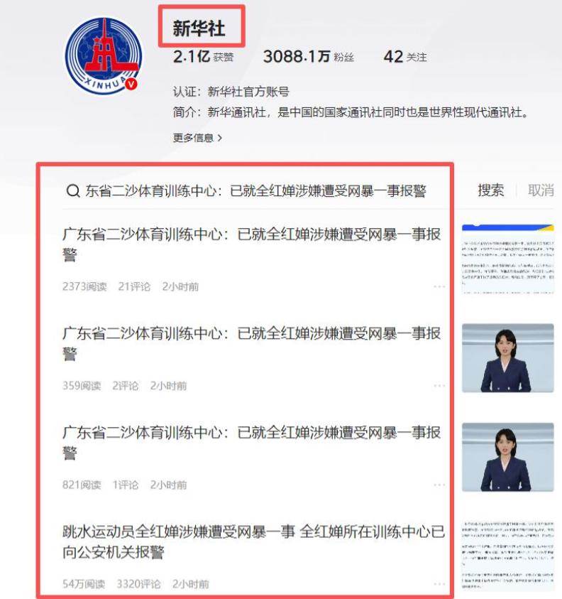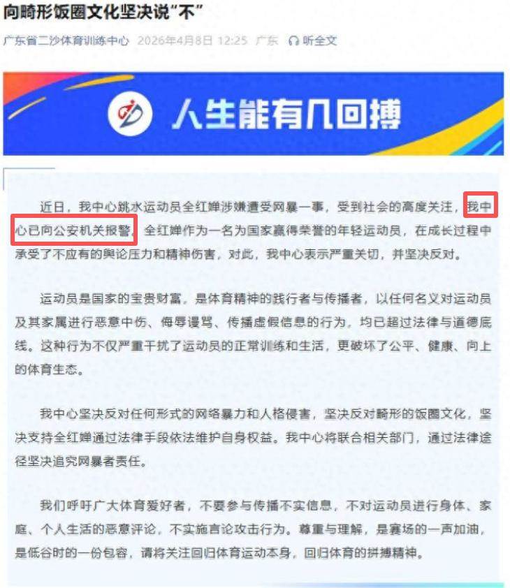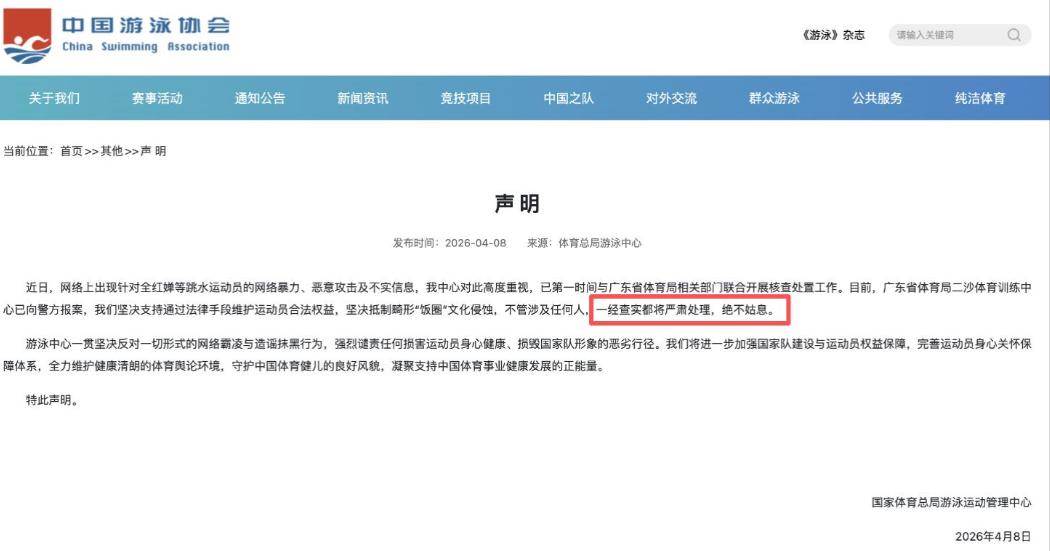 「近日,網路上出現針對全紅嬋等洗水運動員的網路暴力、惡意攻擊及不實資訊,我中心對此高度重視,已第一時間與廣東曾體育局相關部門聯合開展核查處置工作。目前,廣東省體育局二沙體育訓練中心已向警方報案,我們堅決支援透過法律手段維護運動員合法權益,堅決抵制畸形‘飯圈’文化侵蝕,不管涉及任何人,一經查實都將嚴肅處理,絕不姑息。」