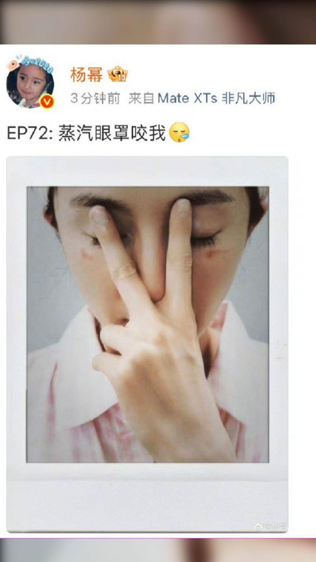 楊冪在微博曬出近距離受傷照,畫面中可以看到她的右眼下方有兩條平行的明顯紅印,雖然范圍不算大,但在白皙肌膚上仍顯得相當扎眼。面對突發意外,楊冪依舊展現招牌幽默感,俏皮寫下「蒸汽眼罩咬我」,疑似是在忙碌拍戲間隙,想藉由眼罩舒緩疲勞,卻沒想到發生燙傷意外。不少網友看過照片後心疼直喊:「女明星的臉真的要好好保護」、「光看照片就覺得很痛」。