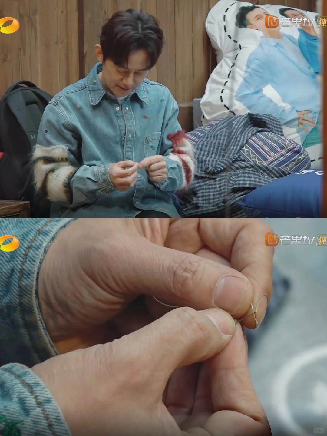 有一次節目組安排做針線活,他拿著針和線,眼睛瞪得溜圓,手卻控制不住地抖。