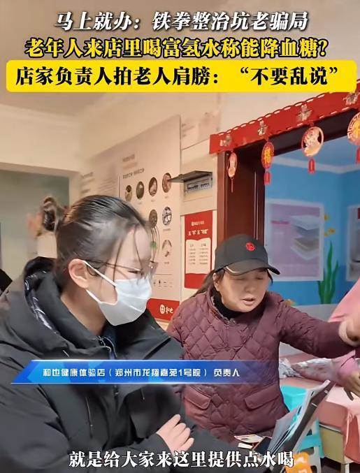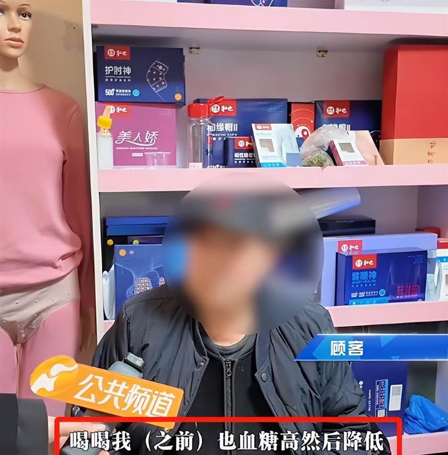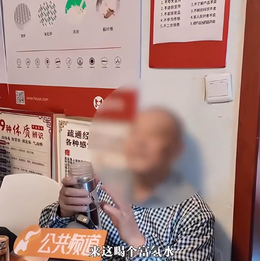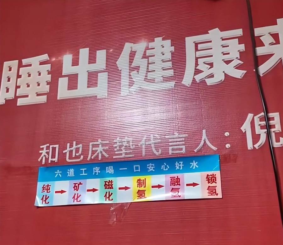 鏡頭裡的分店,牆上掛著倪萍代言床墊的大海報,旁邊卻擺著「富氫水降血糖」的標語。