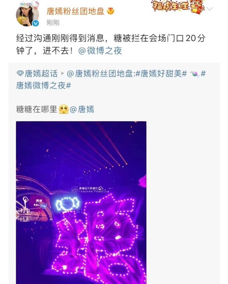 她參加微博之夜當晚還去趕場了一個直播,到達微博之夜的時候就已經遲到了,被攔在門外進不去。