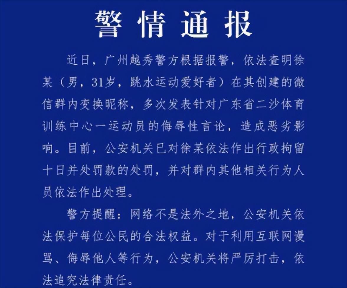 4月10日晚上,一則來自公安部網安局的通報,把一樁持續數年的網路暴力案徹底擺在了陽光下。 一個31歲、名叫徐某的男子,因為建立並管理一個專門辱罵奧運冠軍全紅嬋的微信群,被廣州越秀警方依法處以行政拘留十日並罰款。