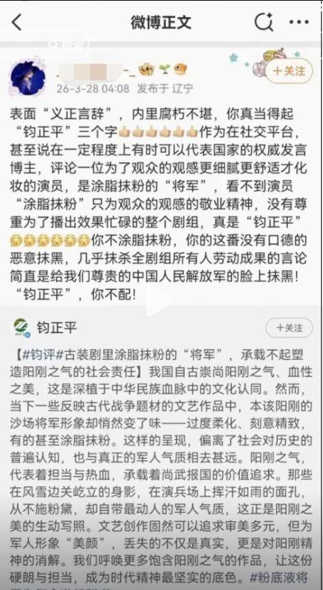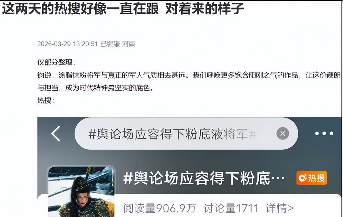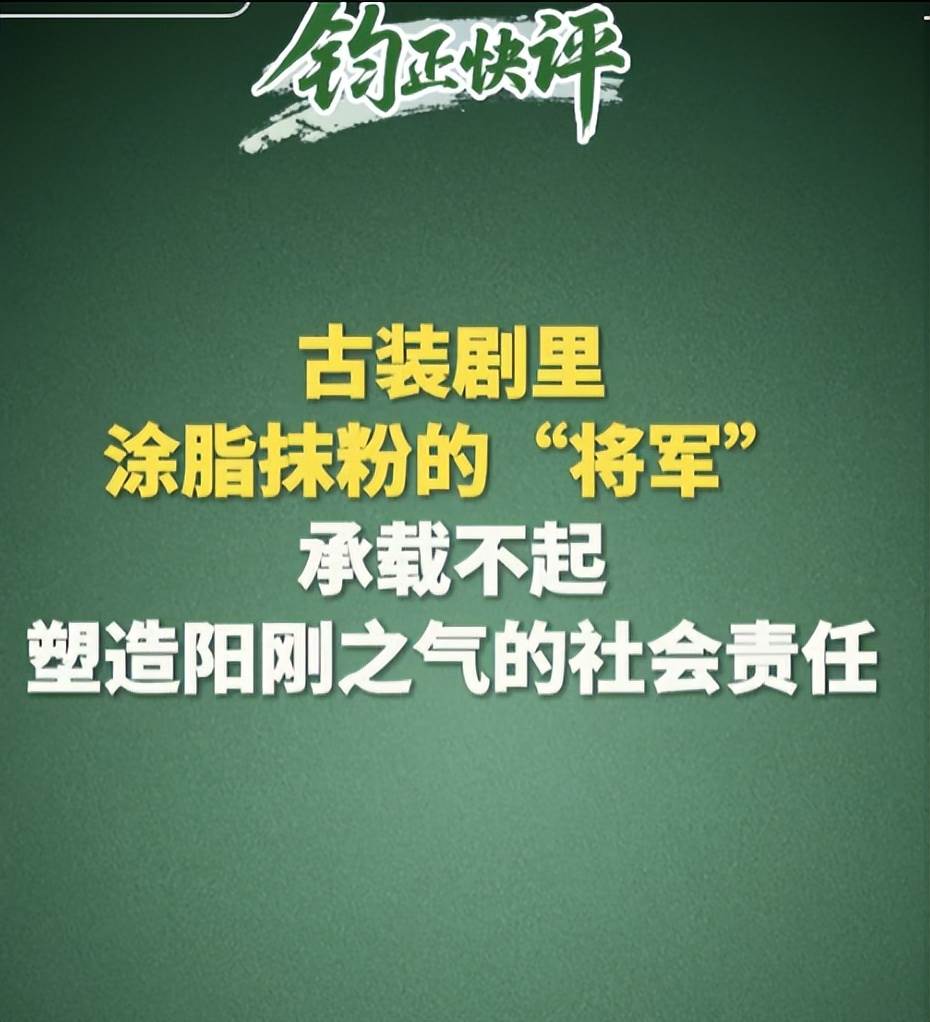 3月27日,鈞正平工作室釋出評論,標題是《古裝劇裡塗脂抹粉的「將軍」,承載不起塑造陽剛之氣的社會責任》。