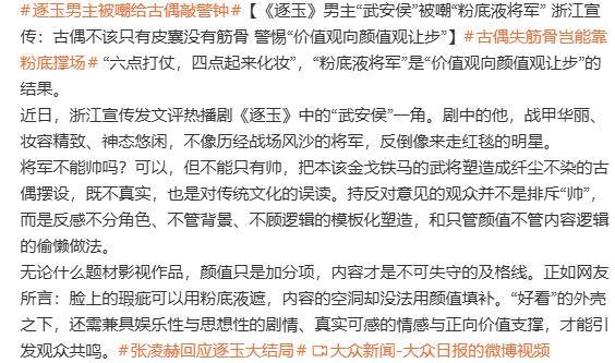 緊接著浙江宣傳也發文說「古偶不該只有皮囊沒有筋骨」。