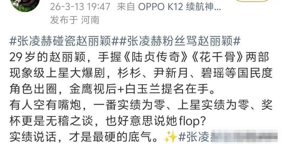 粉絲行為偶像買單,在趙麗穎紮實的觀眾緣面前,張凌赫的風評已在無形中迎來翻車。