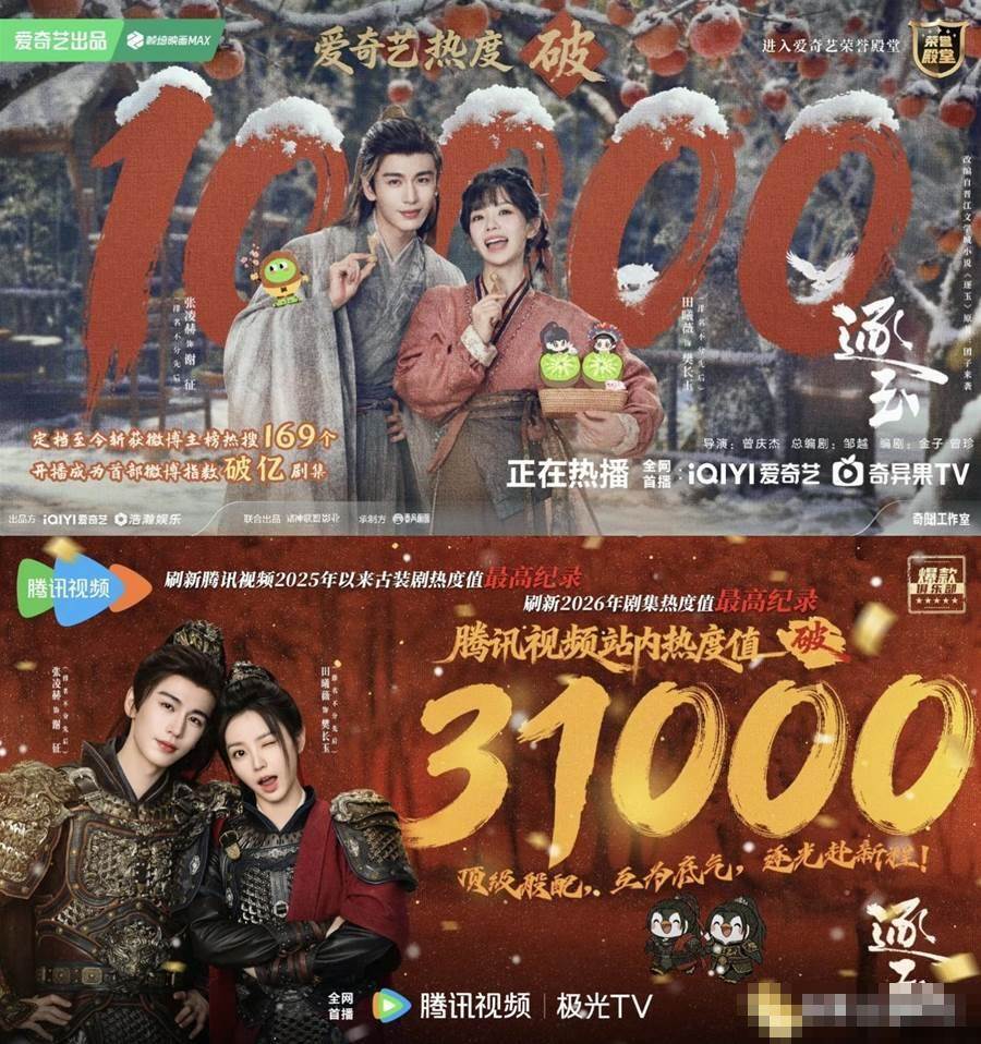 《逐玉》播出後,在愛奇藝、騰訊影片站內熱度雙雙破萬,成為了史上雙平臺破萬的劇集。