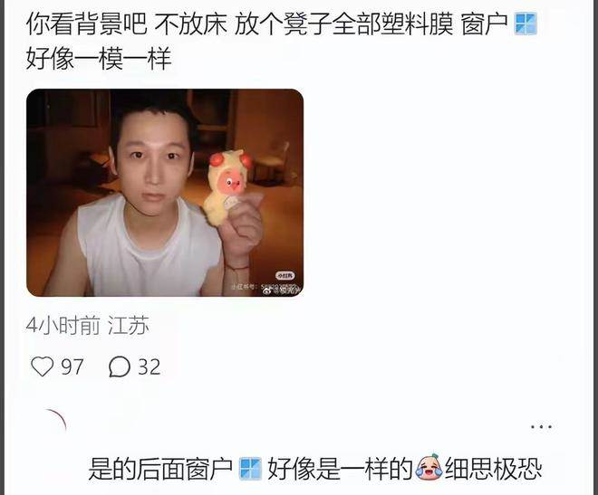 這一曬可不得了,有眼尖的網友發現,這房間布局和于朦朧墜樓的房間簡直像一個模子里刻出來的。一樣的窗,旁邊還都放著凳子和塑料膜,就好像是照著樣板間裝修的。