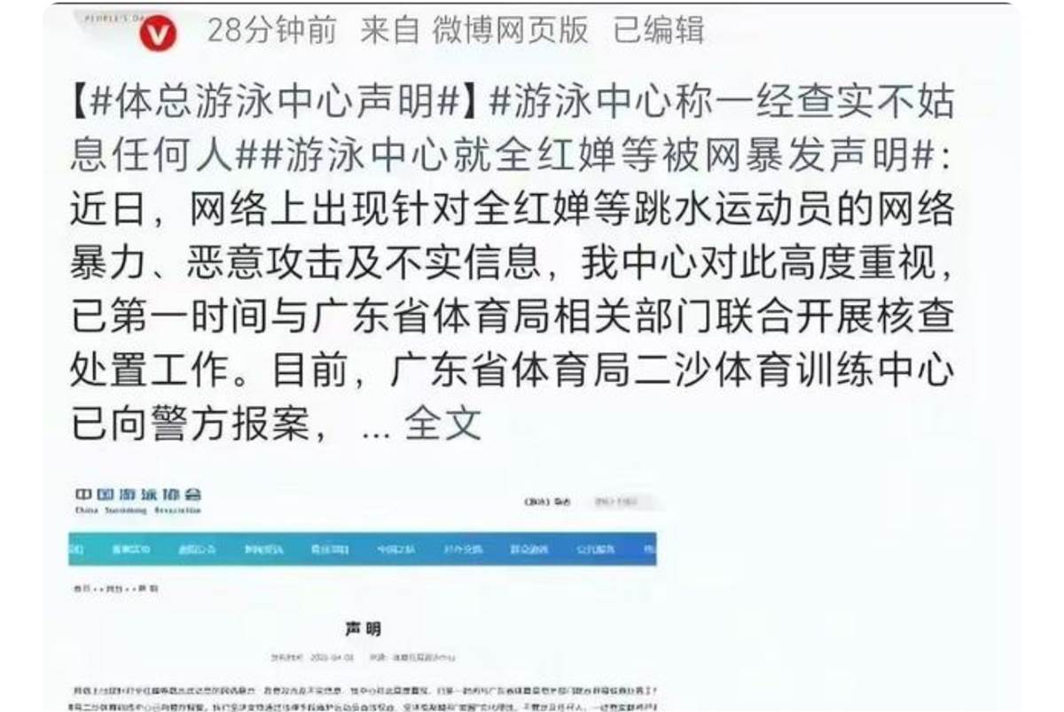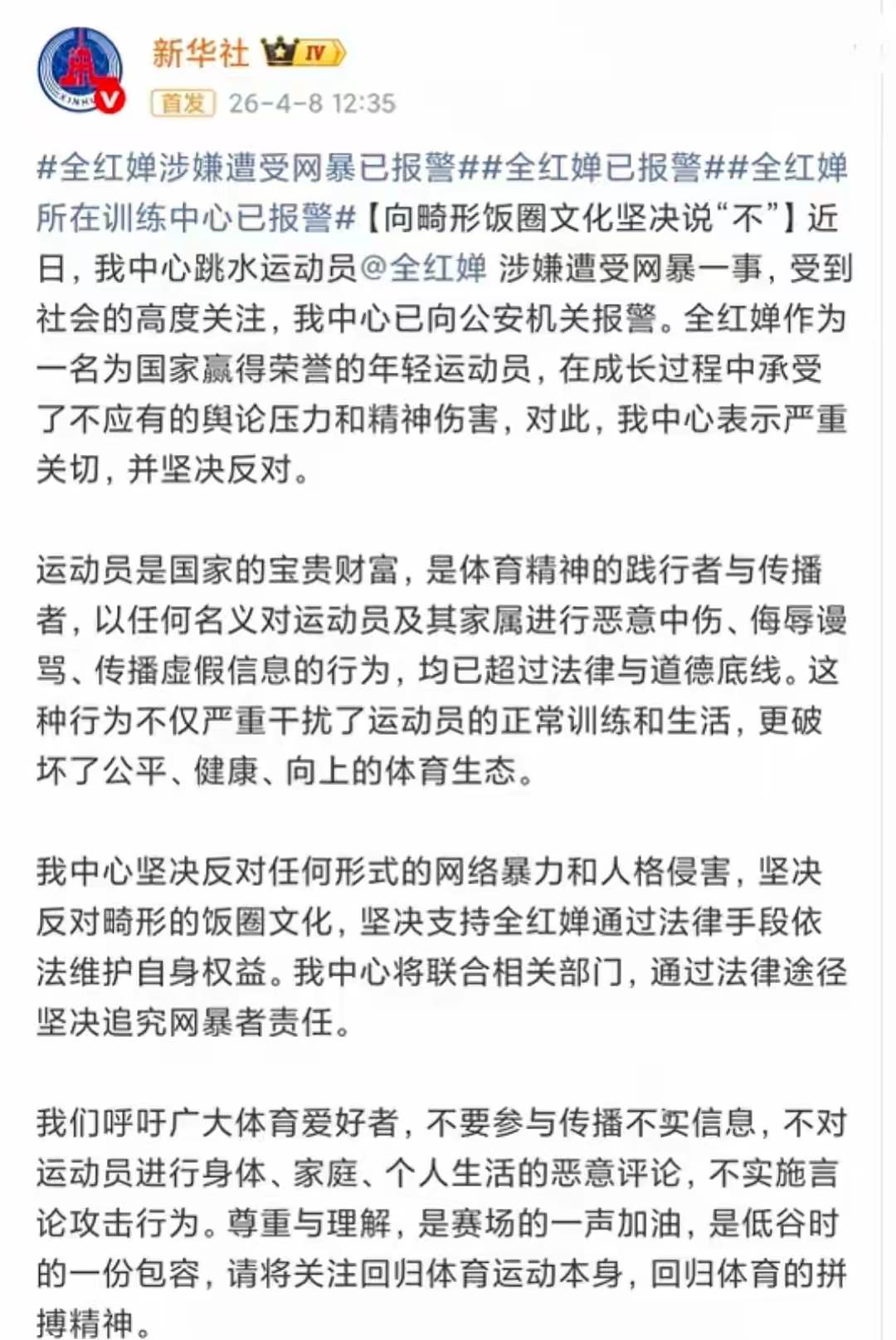 這場針對全紅嬋的網路困擾,早已持續許久,直到2026年4月8日,相關處置動作正式公開。廣東省二沙體育訓練中心聯合國家體育總局游泳運動管理中心,釋出加蓋公章的官方宣告,宣告內容直接明確,相關方已就全紅嬋遭受網路惡意攻擊、誹謗侮辱一事,向公安機關正式報案,沒有模糊的表態,直接啟動法律程式。