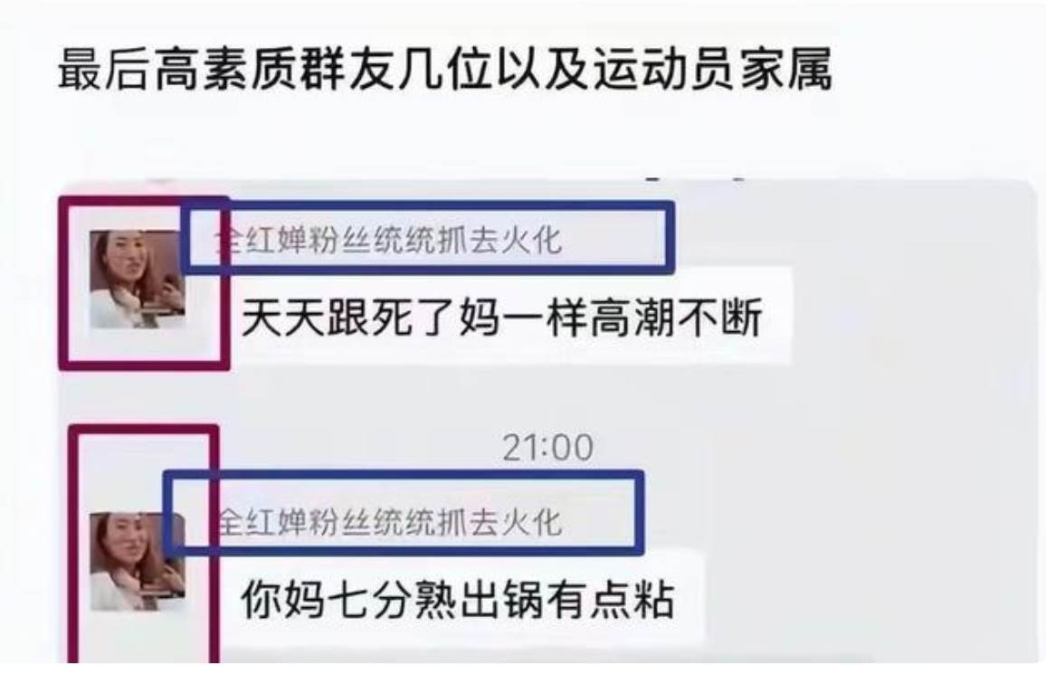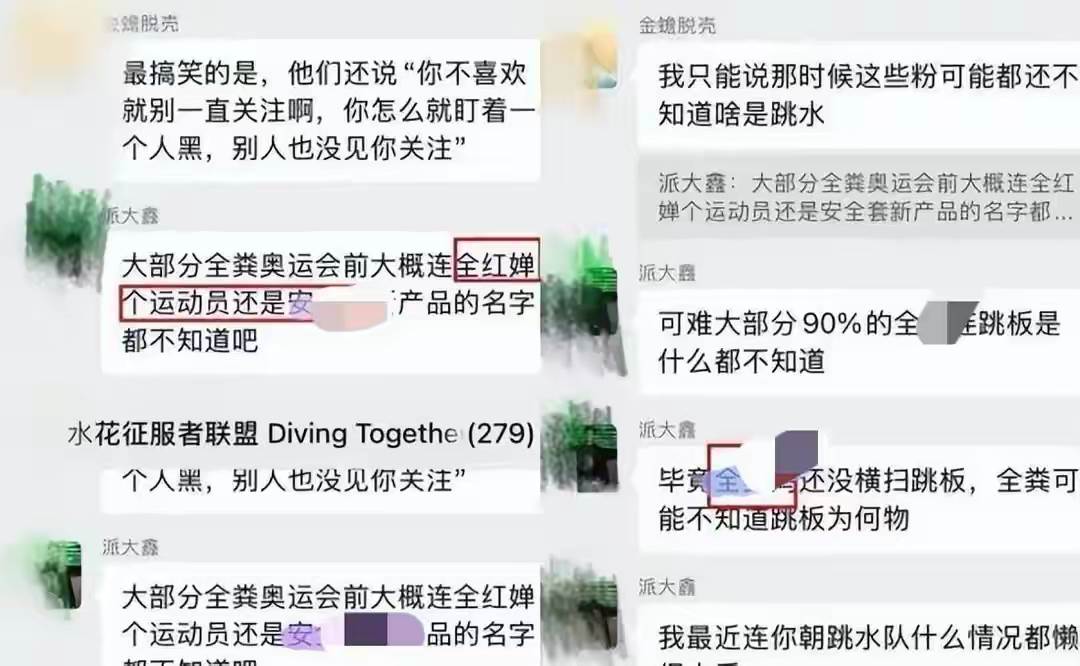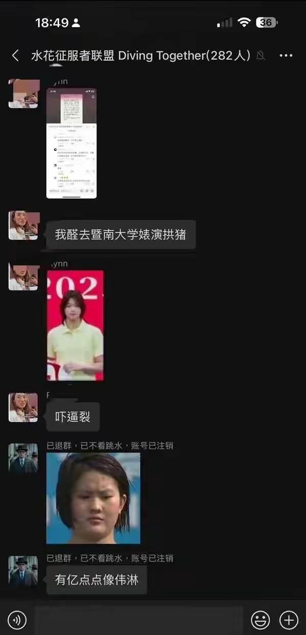這個充斥惡意的群聊中,混入不少體育相關領域人員。有退役跳水隊員在群內發表針對全紅嬋腿部形態的評價,言語間帶著不符合身份的評判;有省級媒體體育記者,多次在群內釋出針對全紅嬋家庭資金的不實揣測言論;還有參與過東京奧運會跳水決賽執裁的國際裁判,以特定暱稱混跡群中,轉發質疑全紅嬋心理素質的不實推文,這些本應秉持客觀、專業立場的人,卻參與到這場惡意攻擊之中。