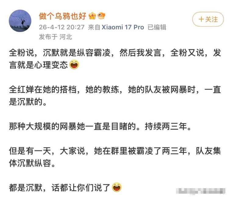 4月11日變本加厲,造謠全紅嬋讓教練、搭檔、隊友都在光芒之下,還指責全紅嬋不敢為教練、隊友說公道話,縱容霸凌,把隊友當成墊腳石。