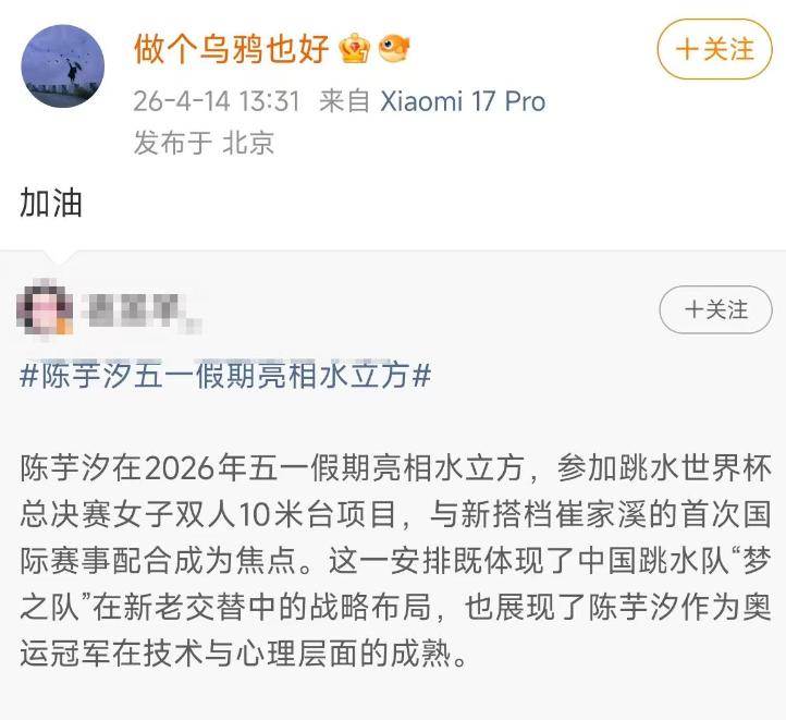 她評論陳芋汐領銜出戰世界盃總決賽、全紅嬋缺席的新聞只發了「加油」二字,看似中立實則蹭熱度,被網友一眼看穿。