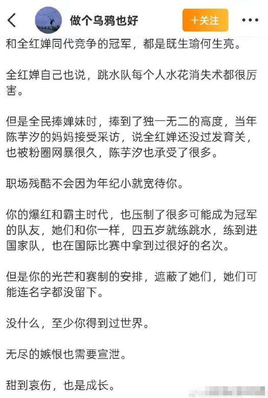 于是她玩起了拉踩套路,特意轉發讚美陳芋汐的文章,暗戳戳諷刺全紅嬋遮擋了隊友的光芒,把飯圈對立的髒水硬生生潑到兩個無辜運動員身上。