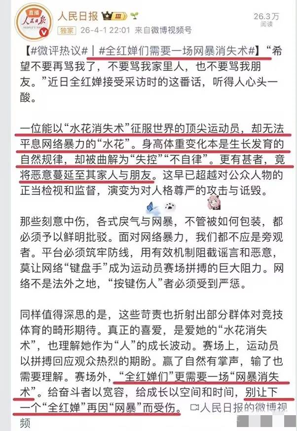 全紅嬋2021年東京奧運奪冠後,針對她和家人的惡意言論就開始在網路傳播,2022年進入青春期後,她因身體發育調整技術,網暴者藉機展開了更密集的攻擊。
