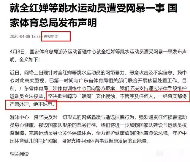 目前廣東體育局全程跟進案件處理,國家體育總局也公開表態,堅決支援全紅嬋依法維權,後續會嚴懲查實的所有違規人員,多家國家級權威媒體也聯合發聲,明確指出網絡不是法外之地。