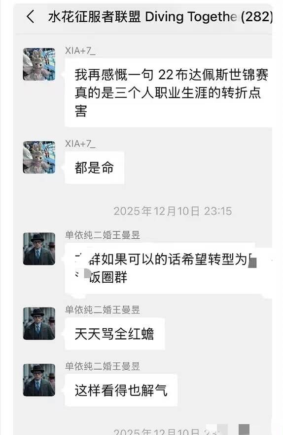這個名為「水花征服者聯盟」的微信群,從2022年就開始運作,最終積累成員達到282人,其中不乏跳水圈內運動員、裁判和行業媒體從業者,群內還定下特殊規則,明確允許肆意侮辱全紅嬋,卻禁止攻擊其他運動員,傾向性十分明顯。